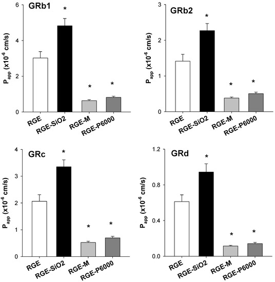 As ginsenoside is a biopharmaceutical classification system (BCS) class III drug [33], it has high solubility but low permeability, which may explain the low bioavailability of the ginsenosides. Therefore, it is pertinent to evaluate the use of carriers and whether they can improve the permeability of solid dispersion formulations of RGE. The intestinal permeability for each formulation is shown in Figure 7. The gastrointestinal permeation of GRb1 from RGE-SiO2 was significantly higher than that of RGE; however, GRb1 permeability from RGE-M and RGE-P6000 significantly decreased by 79.1% and 73.1%, respectively, compared with that from RGE. The permeability of GRb2, GRc, and GRd from the solid dispersion formulations of RGE was similar to that of GRb1.