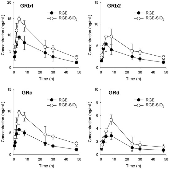 Plasma concentrations of ginsenoside Rb1 (GRb1), GRb2, GRc, and GRd after single oral administration of RGE (375 mg/kg) and solid dispersion formulation of RGE-SiO2 (375 mg/kg as RGE) in rats. Data points represent the mean ± SD (n = 4).