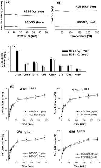 DSC thermograms of RGE-SiO2 stored in 30% RH at 25 °C for 1 year and freshly prepared RGE-SiO2 were also compared using a DSC Q2000 (TA Instruments, New Castle, DE, USA).