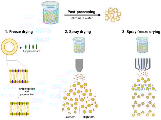 The purpose of applying post-processing techniques to the prepared liposomes is, in general, to develop dried liposomes with a higher stability and a great accessibility for drug administration in comparison with aqueous liposomes [12]. In this section, the effects of common post-processing techniques including freeze drying, spray drying and spray freeze drying on the stability and bioavailability of liposomes are summarized according to the current studies (Figure 1). This review not only introduces the advantages and limitations but also discusses effective solutions to overcome the limitations of each drying technique.