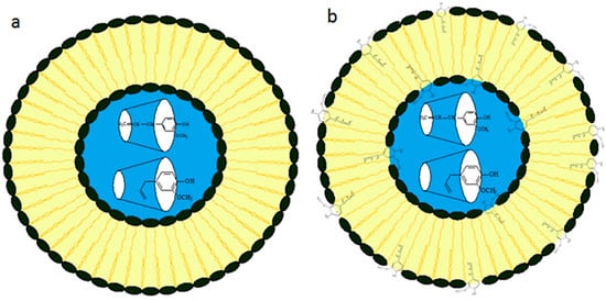 Liposomes are amphiphilic vesicular structures composed of an internal aqueous phase surrounded by one or several bilayer membranes of phospholipids. This amphiphilic nature allows liposomes to encapsulate both hydrophilic and hydrophobic substances into their structures without any association with surfactants [4]. The major constituents of liposomes—in general, phosphatidylcholine and cholesterol—do not convey surfactant characteristics, making liposomes the safest and most suitable drug delivery system for humans because of their biocompatibility, biodegradability and low toxicity [9,10]. The ability of liposomes to encapsulate unstable compounds such as drugs, vitamins, antioxidants and antibacterial agents has been reported to have numerous advantages such as a high encapsulation efficiency, high solubility and high protection capability with an increased bioavailability of active compounds. Those advantages also ultimately increase the ability of liposomes as delivery systems with an effective control-release feature at the site of action [9,13,14,15].