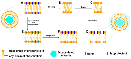 Parameters such as the rate of freezing, liposome preparation method, bilayer composition and residual moisture content have been reported as critical factors involved in the stability and physicochemical properties of lyophilized liposomes [43]. For example, Franzé et al. [3] described that a rapid freezing rate, which involves the formation of small ice crystals, can reduce the disruption of the bilayer structure of liposomes. However, a slow freezing rate can have a negative effect on altering the liposome structure. A few studies have reported damage to the lipid bilayer due to the formation of large ice crystals as a result of the slow freezing process but a few studies, in contrast, reported the recovery of the bilayer membrane from deformations caused by mechanical stresses and osmotic pressure, which occurred due to less formation of ice crystals as a result of the slow diffusion of molecules across the bilayer when the external phase became concentrated due to freezing [3,41].