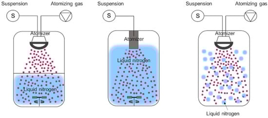 The SFL technique (Figure 5) uses an insulated spray nozzle, which is directly connected to the cryogenic liquid. Hence, the droplets begin to freeze immediately upon contact with the cryogenic agent [60]. Lastly, the SFV technique provides the freezing of droplets when they come into contact with a gaseous cryogenic medium in the chamber (Figure 5).