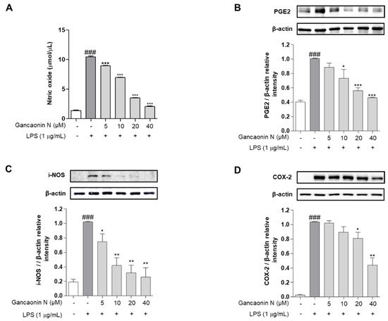 NO assay was performed according to our method previously described [42]. Briefly, RAW264.7 cells were seeded in a 6-well plate (6 × 105 cells/well). The cultured medium was exchanged for each Gancaonin N dose 2 h prior to treatment with 1 μg/mL LPS. The cells were then incubated for 24 h. Thereafter, the cultured medium of each well and Griess reagent were mixed and reacted for 10 min, and absorbance was measured at 540 nm.