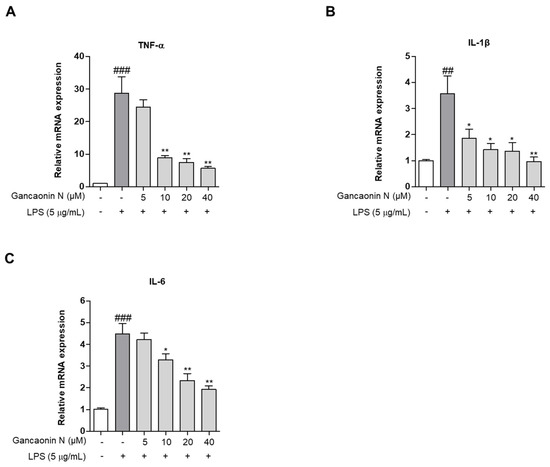 (A–C) Effects of Gancaonin N on pro-inflammatory cytokine mRNA expression in LPS-induced A549 cells. Gancaonin N (5–40 μM) was pretreated 2 h prior to LPS-induced inflammation in A549 cells, incubated for 24 h with LPS (5 μg/mL). The mRNA expressions of cytokine were investigated by real-time PCR analysis. Values are represented as means ± SEM. ## p < 0.01, ### p < 0.001 are significantly different from non-treated group; * p < 0.05, ** p < 0.01 are significantly different from only LPS-treated group.