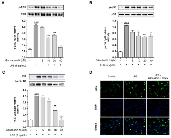 Based on the inhibitory effect of Gancaonin N on the expression of pro-inflammatory cytokines and COX-2, to further analyze the mechanism of anti-inflammatory effects, the protein expression level of the MAPK/NF-κB signaling pathway associated with inflammation was evaluated using immunoblotting. As a result, the phosphorylation of ERK and p38 was increased in A549 cells induced by LPS alone, but the phosphorylation of ERK and p38 was effectively suppressed in the 10–40 μM Gancaonin N pretreatment group (Figure 5A,B). In the nuclear fraction, it was confirmed that the nuclear translocation of NF-κB p65 was inhibited by Gancaonin N in LPS-induced A549 cells (Figure 5C). To further demonstrate the following procedure, we measured the expression of NF-κB p65 in the nucleus using immunofluorescence analysis and we found that 40 μM Gancaonin N significantly inhibited the nuclear translocation of NF-κB p65 via LPS stimulation (Figure 5D). Thus, Gancaonin N regulates the expression of pro-inflammatory cytokines and inflammatory mediators, such as COX-2, through inhibition of the MAPK and NF-κB signaling pathways.