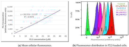 The uptake of the fluorescent P2.2 photosensitizer by HT29 tumor cells. Cells were incubated for 24 h with 2.5–40 µM P2.2. Intracellular P2.2 was evaluated by flow cytometry, based on the red P2.2 fluorescence. Fluorescence data, expressed in arbitrary units, and their median values in each sample were obtained with the BD FACSDiva software (Becton Dickinson). (a) Median cellular fluorescence. Data are presented as the mean value of the median fluorescence of each sample of the triplicate (mean ± SEM). Comparison between samples treated with consecutive P2.2 concentrations was performed using Student’s t-test considering unequal variances: ** p < 0.01, *** p < 0.001. (b) Fluorescence distribution in samples treated with various P2.2 concentrations. The represented SD values, obtained with the BD FACSDiva 6.1 software, are a measure of the fluorescence values spread around the mean value in a defined cellular population.