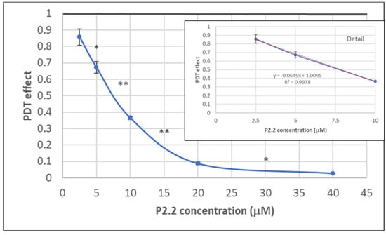 The dependence on P2.2 concentration of MTS reduction by HT29 tumor cells at 24 h post-PDT. Results are presented as PDT effect (mean ± SEM) in triplicate samples. PDT effect was calculated as OD in PDT-treated samples divided by the mean value of OD in control samples. Comparison between samples was performed using Student’s t-test: paired two sample for means: * p < 0.05, ** p < 0.01.