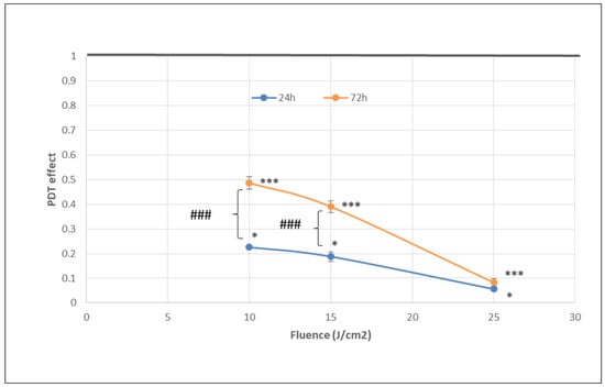 The dependence of MTS reduction by PDT-treated HT29 tumor cells on the fluence of the activation light delivered at a fluence rate of 50 mW/cm2. Results are presented as PDT effect (mean ± SEM) in triplicate samples. PDT effect was calculated as OD in PDT-treated samples divided by the mean value of OD in control samples. Comparison between samples was performed using Student’s t-test considering unequal variances: comparison between PDT regimens at a specific time-point: * p < 0.05, *** p < 0.001; comparison between samples at 24 h and 72 h: ### p < 0.001.