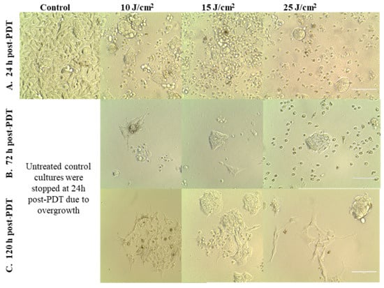 This observation was sustained by microscopic investigations that showed the presence of adhered cells at 24 h and 72 h post-PDT, most probably viable cells, even in the case of the stronger PDT regimen of 25 J/cm2 (Figure 5A,B). While the number of adhered cells decreased over time, a few cells that appeared to be less affected by PDT continued to slowly proliferate and formed cell islets at 120 h post-PDT (Figure 5C).