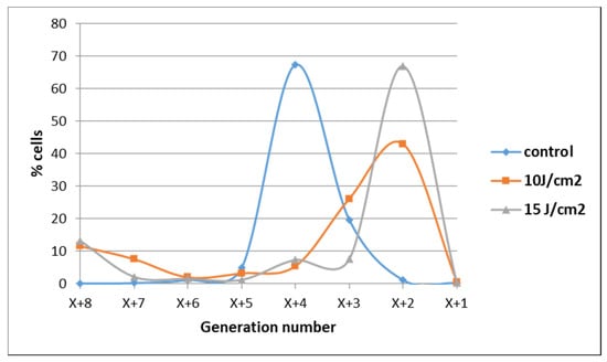 Demonstrative data on the proliferation of HT29 tumor cells subjected to PDT (fluences: 10 J/cm2 and 15 J/cm2; fluence rate: 50 mW/cm2) vs. non-treated control cells at 72 h post-PDT. Results are presented as a percentage of cells in various consecutive daughter generations in comparison with the parent population distanced by X previous generations. Data were obtained by flow cytometry with CFDA-SE and were processed using the ModFit LT software.