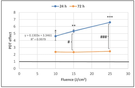 The dependence of LDH release by PDT-treated HT29 tumor cells on the fluence of the activating light delivered at a fluence rate of 50 mW/cm2. Analysis was performed at 24 h and 72 h post-PDT. Results are presented as PDT effect (mean ± SEM) in triplicate samples. PDT effect was calculated as OD in samples subjected to PDT divided by the mean value of OD in control samples. Comparison between samples was performed using Student’s t-test considering unequal variances: comparison between PDT regimens at a specific time-point: * p < 0.05, ** p < 0.01, *** p < 0.001; comparison between samples at 24 h and 72 h: # p < 0.05, ### p < 0.001.