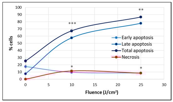 The percentage of apoptotic and necrotic HT29 cells in samples exposed to PDT (10 J/cm2 and 25 J/cm2, 50 mW/cm2) and in non-treated controls. Apoptosis and necrosis were assessed by flow cytometry using FITC-annexin V and propidium iodide at 24 h post-PDT. Results are presented as percentage (mean ± SEM) of cells in triplicate samples, regarding early, late and total apoptosis, as well as necrosis. Comparison between treated and non-treated samples was performed using Student’s t-test considering unequal variances. * p < 0.05, ** p < 0.01, *** p < 0.001.