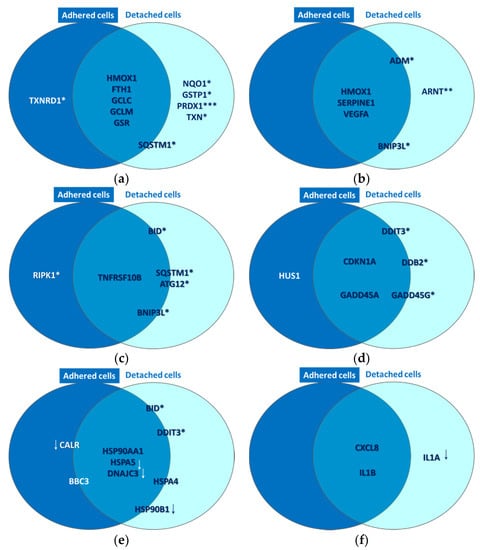 Common and distinctive gene expression patterns in adhered and attached HT29 tumor cells that were exposed to P2.2-PDT (10 J/cm2, 50 mW/cm2) at 24 h post-PDT. Some selected genes with modified expression in PDT-treated cells as compared to untreated cells (1.5 < FR < −1.5, p < 0.05) are represented. These genes are involved in (a) oxidative stress, (b) Hypoxia signaling, (c) cell death, (d) DNA damage, (e) unfolded protein response and (f) inflammation. All the reported genes were upregulated, excepting those marked with downwards arrows. Genes placed at the borders of the two circles are expressed both in adhered and detached cells, but have higher expression in one of the two cell types. This comparison between gene expression levels in adhered and detached cells was performed with a paired samples t-test (* p < 0.05, ** p < 0.01, *** p < 0.001).