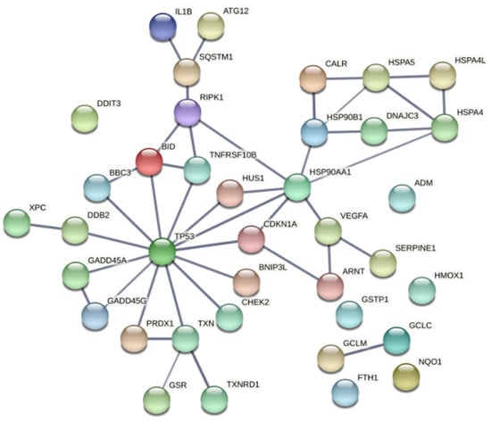 Functional associations between the tumor suppressor TP53 and the proteins encoded by genes with modified expression in PDT-treated HT29 tumor cells, as compared to non-treated cells (Table 2). The network was built using the online tool “STRING: functional protein association network”. Only connections deriving from experiments and databases, with a high confidence of 0.7, are represented.