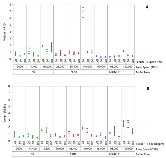The influence of feeder speed and press speed on tablet weight variability (%RSD) for formulation 1 “good flow” across three tablet presses is shown in Figure 1A. Good control of tablet weight variability can be observed across all three tablet presses, with the Modul P showing the lowest tablet weight %RSD across different feeder speeds and press speeds (Figure 1A). The exception to the trend can be seen for the combination of lower feeder speed and higher press speed on the Fette 1200i. At these process settings, a large increase in tablet weight variability was measured. It was also noted that for this setting, there was a reduction in average tablet weights (221.1 ± 2.84 mg) and failure to achieve the target tablet weight of 240 ± 18 mg. At all other settings, the target weight specification was achieved for this formulation. The high tablet weight variability was attributed to starving of dies at the lower feeder speed and high press speed, which was not sufficient to feed enough material into the dies reproducibly.