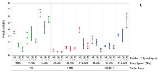 Plot of tablet weight variability (%RSD) for three formulations compacted on three tablet presses. (A) Good-flow formulation, (B) Medium/fair-flow formulation and (C) Passable-flow formulation. Each point on the graph signifies % RSD for n = 20 tablets. Approximately 12,000 tablets were compacted for individual runs in a DoE. A total of three in-process checks (IPCs) were performed for 20 tablets after every 4000 tablets compacted, within an individual DoE run. Data point for good flow formulation on Fette 1200i at 20 rpm feeder speed/140,000 TPH press speed was excluded in process model development.