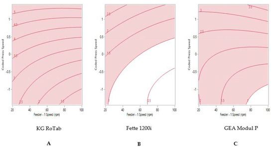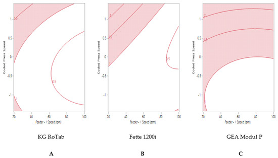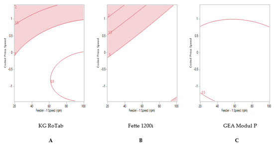 Two-dimensional contour profile showing optimum tablet press speed and feeder speed settings (uncoloured) for formulation 2 “fair” to achieve tablet weight variability ≤1% RSD on (A) KG RoTab, (B) Fette 1200i and (C) Modul P. Coded press speeds refer to standardized press speed for each tablet press by subtracting the mean press speed from actual press speed and dividing by the standard deviation. Refer to supplementary information (Table S4) for the actual press speeds.
