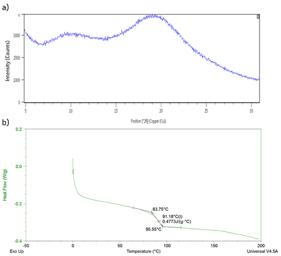 (a) PXRD of co-precipitated amorphous dispersion, and (b) DSC showing Tg of 92 °C for cPAD material.