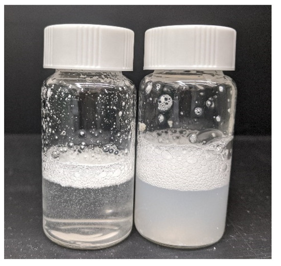 Example comparison between neat co-precipitation amorphous dispersion (left) and hierarchical particle (right) after agitation in DI water.