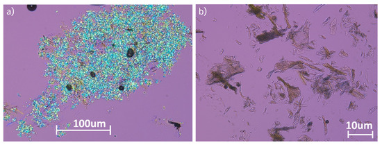 The Lactose and TPGS concentrations were titrated up to 30 wt% lactose and 10 wt% TPGS, at which reasonable surface coverage of the cPAD particles was achieved based on empirical observation using polarized light microscopy (PLM). This assessment was assessed by evaluating the isolated solids first suspended in oil, in which none of the hydrophilic components dissolve (Figure 4a), demonstrating cPAD material is embedded in a crystalline excipient. By dispersing the same hierarchical particles in 0.01 N HCl, water soluble excipients dissolve, demonstrating qualitatively that the substrate cPAD particles remain amorphous even when processed with crystalline excipients (Figure 4b). Figure 5a,b shows SEM images of the neat cPAD material with large flakes of high surface area, while Figure 5c,d shows the crystalline hydrophilic excipients coating the surfaces of the hierarchical particles.
