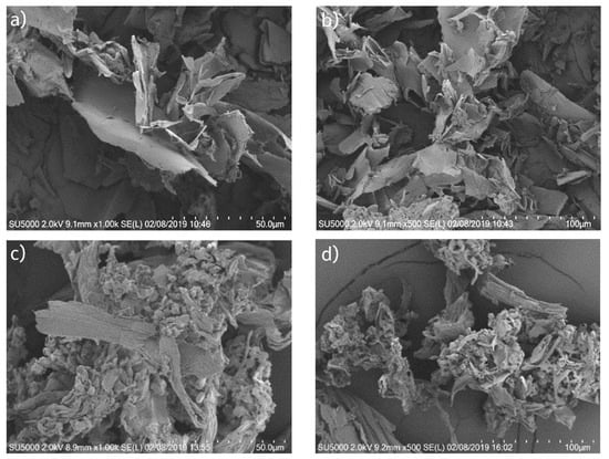 SEM image of cPAD particle isolated without water-soluble excipients, (a) 1000× resolution, (b) 500× resolution; hierarchical cPAD particle generated by isolating amorphous dispersion with water-soluble lactose matrix, (c) 1000× resolution, (d) 500× resolution.