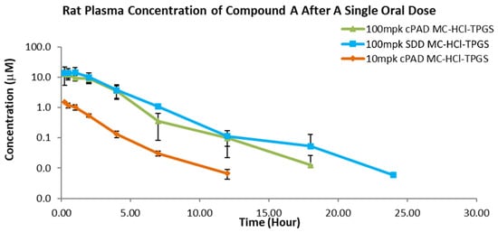 Male Wistar-Han rats were used for oral administration studies. All animal studies were reviewed and approved by the Merck IACUC (Institutional Animal Care and Use Committee, IACUC Number: 2024-601266-APR; start date 1 April 2019). All animals were fasted overnight before dosing, provided water ad libitum, and fed 4 h following drug treatment. The fasted animals were orally given formulations by gavage (n = 3) at a dose of 10 or 100 mg/kg with a dose volume of 5 mL/kg. The vehicle for Compound A cPAD material was 0.5% MC (methylcellulose) with 5 mM HCl. The vehicle for Compound A SDD material was 0.5% MC (methylcellulose) with 5 mM HCl and 1% TPGS. Serial blood samples (250 uL whole blood) were collected at 0.25, 0.5, 1, 2, 4, 8, 12, 18, and 24 h post-dose and placed into EDTA-containing tubes and centrifuged (10,000 rpm for 2 min). Plasma was harvested and stored at −70 °C until analysis. Plasma was protein precipitated with acetonitrile containing 0.1% formic acid and an internal standard analog. Supernatants from the protein precipitation were diluted into water with 0.1% formic acid. Calibrators and unknowns were measured by liquid chromatography-mass spectrometry. Bioanalytical standards were accepted with 25% accuracy and precision. Chromatographic separation was performed on a Thermo Transcend LX2 UPLC (Thermo Scientific, Waltham, MA, USA) with a Waters XSELECT HSS T3 XP (50 × 2.1 mm, particle size 2.5 μm) column with a flow rate of 0.75 mL/min. Mobile phase A consisted of acetonitrile containing 0.1% formic acid. Mobile phase B consisted of water containing 0.1% formic acid. Mass spectrometry quantitation was performed on an AB Sciex 5000 (AB Sciex LLC, Framingham, MA, USA).