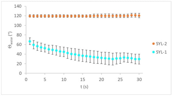 As the contact angles of SYLs were reduced, the water droplets had a lower tendency to spread on the pastille surface. The time-dependency of the water contact angles can be seen in Figure 3.
