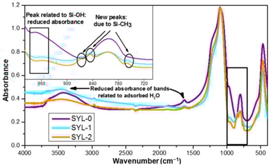 On the other hand, it was necessary to prove that -Si(CH3)3 groups were covalently attached to the surface as a result of the reaction, and the surface density of silanol groups did not decrease because of the storage temperature of 110 °C after the reaction. The functionalization of SYL was proved by IR spectroscopy. The absorption of the samples in the mid-IR range could provide qualitative information on the changes in functional group composition. Figure 4 shows a comparison of the spectra of SYL-1, SYL-2 and SYL-0. According to the analysis, the spectra of both functionalized silicas (SYL-1 and SYL-2) showed the same types of changes.