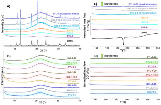A total of 5–20% w/w of LDME was loaded into the SYL pores. The characteristic peaks of the physical mixtures (physical mixtures were prepared in the 5–20% w/w range) and the raw LDME on the diffractogram are shown in Figure 5A. As a result of the loading process, the API became amorphous, which was indicated by the absence of the characteristic crystalline peaks of the API on the diffractograms (Figure 5B). DSC was also used as an additional confirmatory measurement technique to check the success of LDME loading into the mesopores of SYLs. As a result of amorphization, the endothermic peak related to the melting of the crystalline API (Figure 5C) disappeared in the case of the products (Figure 5D) in the investigated range. The methanol content of all products was lower than the requirement of the ICH Q3C (R8) guideline (Appendix A, Table A1).