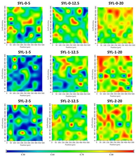 The distribution of LDME in SYLs was investigated by Raman chemical mapping using a Thermo Fisher DXR Dispersive Raman instrument (Thermo Fisher Scientific Inc., Waltham, MA, USA), equipped with a CCD camera and a diode laser, operating at a wavelength of 780 nm. Raman measurements were carried out with a laser power of 24 mW at a slit aperture size of 50 µm. A surface with a size of 100 µm × 100 µm was analyzed with a step size of 10 µm, with an exposure time of 2 s and an acquisition time of 2 s, for a total of 6 scans per spectrum in the spectral range of 3500–200 cm−1 with cosmic-ray and fluorescence corrections. The Raman spectra were normalized to eliminate the intensity deviation between the measured areas.