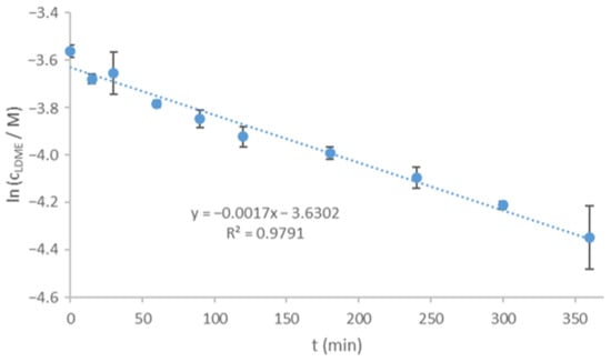 As it is known from the literature that LDME has a tendency to degrade in aqueous media, therefore its stability and degradation kinetics were also determined. A total of 40 ± 1 mg of API was dissolved in the dissolution medium (pH = 6.8 phosphate buffer) which was thermostated at 37 °C. Samples were taken at 0, 15, 30, 60, 90, 120, 180, 240, 300 min quantified by using HPLC with the method detailed in Section 2.13. Three parallels were measured.