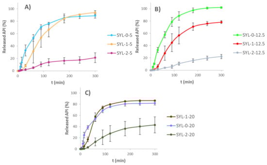 The contact angle of the SYLs was followed with a focus on the mean and standard deviation. The effect of standardizing the reaction on standard deviation was determined by a 2-sample variance test. The change in particle size after loading a SYL with API was also investigated by a 2-sample t-test. All these tests were conducted by Minitab 17 Statistical Software (Minitab Ltd., Coventry, UK). Besides, the statistical comparison of the release results of unique products was carried out by using the Tukey HSD test (n = 3). A certain phenomenon was considered significant when p < 0.05.