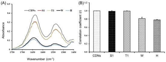33]. Heated (H) and non-lyoprotected (W) CDNs showed a significant reduction in the absorbance profiles in FTIR spectra as compared with freshly prepared CDNs, sucrose-lyoprotected CDNs (S1), and trehalose-lyoprotected CDNs (T1), pointing to denaturation of the proteins present in these CDN. Sucrose-lyoprotected CDNs and trehalose-lyoprotected CDNs showed no sign of denaturation at amide-I and amide-II spectral region, indicating the protective nature of sugars during lyophilization of CDNs.