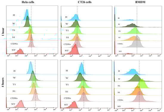 In the case of CT26 cells, after 1 h incubation, we did not observe much difference in the profile between the various CDN types, whereas after 4 h incubation fresh CDNs showed 2.2- and 1.7-fold higher association than non-lyoprotected CDNs (W) and heated CDNs (H), respectively, and no significant difference with sucrose-lyoprotected CDNs (S1) and trehalose-lyoprotected CDNs (T1).