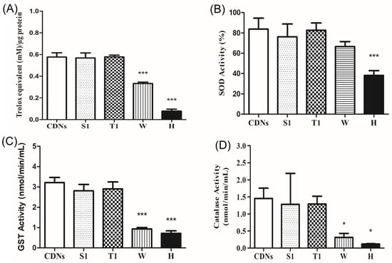 Figure 4B). SOD, GST, and catalase activity were significantly reduced in case of non-lyoprotected CDNs (W) and heat-denatured CDNs (H) (