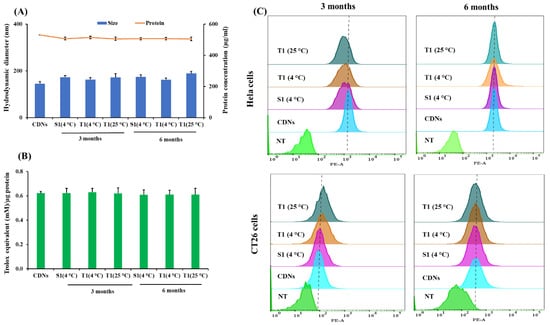 Long-term stability of lyophilized CDNs was investigated in relation to the temperature of storage. CDNs normalized to a protein concentration of 530 µg/mL were lyophilized with sucrose (S1) or trehalose (T1), flushed with nitrogen gas, and kept for stability studies at 4 or 25 °C. Storage temperature was determined based on Tg values. At different time intervals (3 and 6 months), an aliquot was reconstituted and dispersed gently by swirling. The hydrodynamic diameter, protein concentrations, and total antioxidant capacity of CDNs were measured and the cellular uptake by HeLa and CT26 cells were analyzed by flow cytometry.
