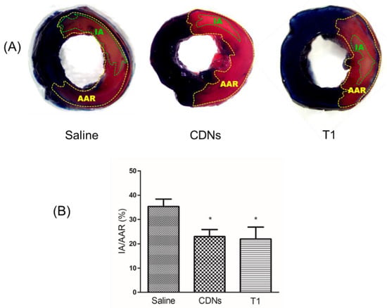 p < 0.05) in myocardial infarct size (22.94 ± 2.91%) within 24 h after administration of CDNs, as evidenced by the smaller percentage of infarct area with respect to the area at risk in CDNs-treated heart than that in saline control heart (35.29 ± 3.07%). Interestingly, lyophilized CDNs with trehalose (T1) and polysorbate 80 reduced the infarct size (21.94 ± 4.90%) to the same extent as freshly prepared CDNs. These results suggest that CDNs, similar to exosomes [