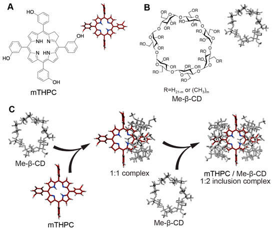 Molecular structures and 3D models of (A) mTHPC and (B) randomly methylated β-cyclodextrin (Me-β-CDs). The degree of substitution (m = 11–14), as reported in the experimental section. (C) The 3D schematic representation of the stepwise formation of 1:2 inclusion host−guest complex between mTHPC and two Me-β-CDs.
