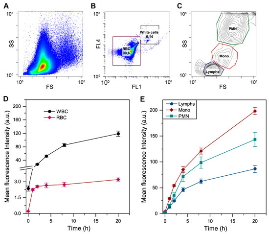 The kinetics of mTHPC uptake in particular subpopulations of blood cells is presented as mean fluorescence intensity (MFI) (Figure 2D,E). In fact, mTHPC accumulation in RBC reaches the plateau at 1 h and does not change until 20 h of incubation. Meanwhile, WBC intensively accumulate mTHPC, and after 20-h incubation, MFI of WBC was almost 40 times higher compared to RBC (119 a.u. vs. 3.2 a.u.). In particular, mTHPC uptake was increasing in the following order: Lymps < PMN < Mono (Figure 2E), reaching MFI of 87, 143, and 198 a.u. at 20-h incubation.