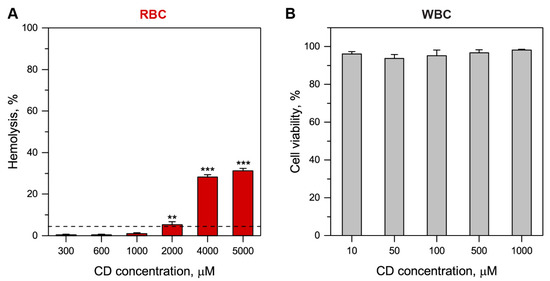 Cytotoxicity of Me-β-CD. (A) Hemolysis assay and (B) WBC viability in the function of Me-β-CD concentration. Hemolysis was analyzed for 2-h incubation with Me-β-CD, while the WBC viability was assessed using PI at 20 h post-incubation. Data represent averages ± SD (n = 3; ** p < 0.01, *** p < 0.001 using the one-sample t-test (µ = 0)). Dashed line corresponds to 5% of hemolysis.