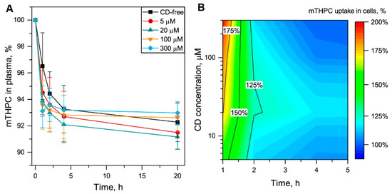 Redistribution of mTHPC from plasma to the blood cells in the presence of Me-β-CD. (A) Kinetics of mTHPC redistribution from plasma to the blood cells in the absence of Me-β-CD (■) and in the presence of 5 µM (●), 20 µM (▲), 100 µM (▼), and 300 µM (♦) of Me-β-CD. Graphs represent the mean ± SD (n = 3). (B) The 2D contour plots of mTHPC uptake in blood cells in the function of time and concentration of Me-β-CD. Uptake of mTHPC in the absence of Me-β-CD was taken as 100%. The concentration of mTHPC was 4.5 µM.