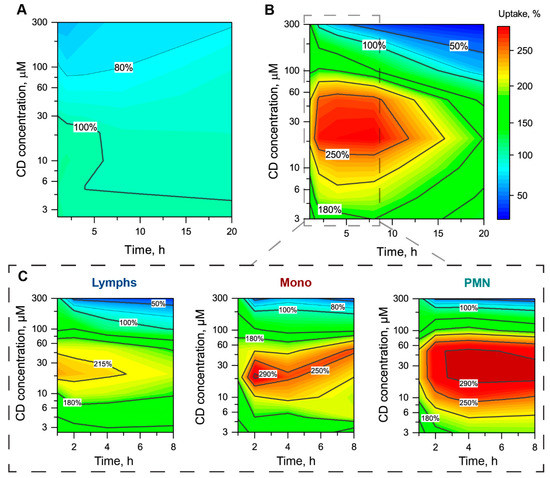 Alteration of mTHPC uptake in different populations of blood cells in the presence of Me-β-CD. The 2D contour plots of mTHPC uptake in (A) RBC, (B) WBC, and (C) particular WBC populations (Lymps, Mono, PMN) as the function of time and concentration of Me-β-CD. Uptake of mTHPC in the absence of Me-β-CD was taken as 100%. The concentration of mTHPC was 4.5 µM.