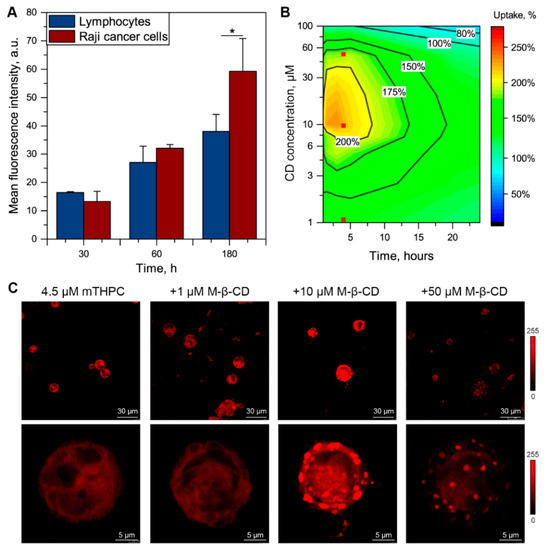In addition, we evaluated the influence of Me-β-CD on the intracellular accumulation of mTHPC in human Burkitt lymphoma Raji cells. For this purpose, we incubated the suspension of Raji cells with 4.5 µM mTHPC in the presence of various concentrations of Me-β-CD. Firstly, we compared cellular uptake of mTHPC in Lymps, isolated from the blood of healthy patients, and Raji cancer cells in Me-β-CD-free conditions (Figure 6A). In fact, Raji better accumulated mTHPC than Lymps from the blood of healthy patients after 3-h incubation (p > 0.05). Of note, at 0.5-h and 1-h incubation, no significant difference in PS uptake was observed between normal Lymp and Raji cancer cells.