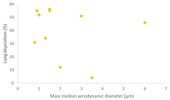 As shown by the data collated and presented in Table 4, two different studies used a combination of beclomethasone dipropionate with formoterol labelled with technetium-99. The first dissolved the particles in hydrofluoroalkane to give an MMAD of 1.3 μm via pressurised metered-dose inhaler (pMDI) [60], the second delivered the solid particles with MMAD of 1.5 μm via a NEXThaler® dry powder inhaler (DPI) [61]. The lung deposition for the pMDI was 34.08% (standard deviation (SD) = 9.3%), and the DPI had a lung deposition of 55.2% (SD = 3.7%). This shows that even though the same APIs were used, and the particle sizes were similar, the way that the API is formulated plays a significant role in the lung deposition of the particles. It is apparent that the type of the API has an effect by comparing the lung deposition of albuterol and beclomethasone dipropionate with formoterol in the pMDI considered previously [62]. They both have an MMAD of 1.5 μm, are labelled with technium-99 and are administered using an pMDI; however, the lung deposition of albuterol was 56.3% (SD = 9.2%), which is considerably higher than the beclomethasone, which has a lung deposition of 34.08% (SD = 9.3%). This suggests that API type and formulation must also be carefully considered when formulating drugs for pulmonary drug delivery.