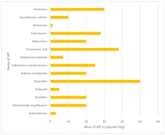 Many different methods have been used to develop dry powders for inhalation, also shown in Table 6, and each method produces variation to yield, cost of production and manufacture time. This data shows the difference in the size of the doses able to be formulated in DPIs for inhalation, compared to current doses available for inhalation (Figure 2). This also suggests that the use of carrier free inhalation technology can play a key factor in addressing the challenge of increasing doses of drugs for pulmonary drug delivery. Also noted is the wide range of drug classes that are being considered with regards to delivery via dry powder inhalation, including non-steroidal anti-inflammatory drugs (NSAIDs, i.e., ibuprofen and indomethacin), antimicrobials (i.e., tobramycin and netilmicin), antihistamines (i.e., ketotifen), and phosphodiesterase type 5 inhibitors (i.e., sildenafil). It was also noted that for many antimicrobials, there is the possibility of creating drug combinations within the same device—a useful tool for patients who require complex antimicrobial treatment.