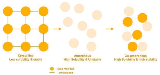 Most solid APIs exist in a crystalline state held together by strong intermolecular bonds, and therefore, display good stability profiles (Figure 3). However, the crystalline state often shows poor solubility, due to the high energy required to break the crystalline lattice which creates a major problem for developing new APIs [112,113]. There has been much interest in the process of ‘drug amorphisation’, to address poor solubility, which involves the conversion from a crystalline state to an amorphous solid state. The amorphous solid state offers an improved solubility and dissolution rates as a result of possessing higher entropy [114,115,116]. The advantages associated with higher energy forms are often negated, due to recrystallisation to a more thermodynamically stable form during processing and storage [117,118,119]. This can limit applications, and so the production and maintenance of amorphous drugs with adequate stability remain a challenge. Formulation strategies based on solid molecular dispersions are being explored, including polymeric amorphous solid dispersions (PASDs), and more recently, coamorphous solid dispersions (CASDs).
