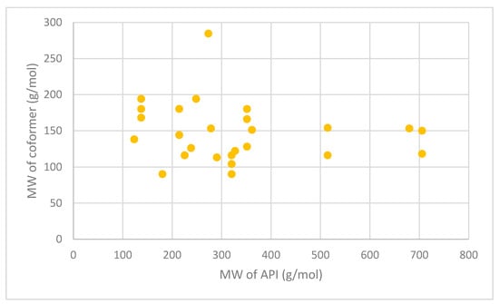 A scatter graph of the data from Table 8 comparing the molecular weights of the APIs and their coformers.