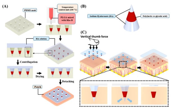 Schematic illustration of the fabrication process and application of an HMP-DMN patch. (A) Fabrication process using a PDMS mold. Heat-melted PLGA mixture loaded with rhodamine B was dispensed into the PDMS molds with the help of a dispenser robot and temperature control unit. Subsequently, the HA solution was cast into the PDMS mold, centrifuged, and dried. Finally, the HMP-DMN patch was detached from the PDMS mold. (B) Structure of an HMP-DMN. An HMP-DMN consists of three parts: HA—tip, PLGA mixture—middle, and HA—base layer. (C) Schematic representation of the application and separation of the HMP-DMNs from the patch. The HMP-DMN patch is inserted into the skin surface using vertical thumb force, following which the PLGA mixture separates from the patch upon dissolution of the HA base layer. The implanted PLGA mixture part then releases the drug inside the skin tissue in a sustained manner. (HMP-DMN: heat-melt PLGA dissolving microneedle, PDMS: polydimethylsiloxane, PLGA: poly(lactic-co-glycolic acid), HA: sodium hyaluronate).