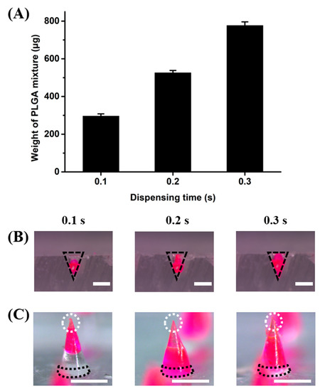 The amounts of PLGA mixtures in the molds at different dispensing times. (A) The amounts of PLGA mixtures increased as the dispensing time increased, in the order of 0.1, 0.2, and 0.3 s. (B) Microscopic images of the PLGA mixtures after they were dispensed into the molds (black dashed line: shape of the hole in the mold). The volume of the PLGA mixture increased as dispensing time increased. Scale bar: 500 µm. (C) Microscopic images of HMP-DMNs fabricated with different dispensing times of the PLGA mixture (0.1, 0.2, and 0.3 s) (dotted white circles: tip area; dotted black line: base area). Only the group with a dispensing time of 0.1 s had a base area that consisted of only HA. Scale bar: 500 µm. (PLGA: poly(lactic-co-glycolic acid), HMP-DMN: heat-melt PLGA dissolving microneedle, HA: sodium hyaluronate).